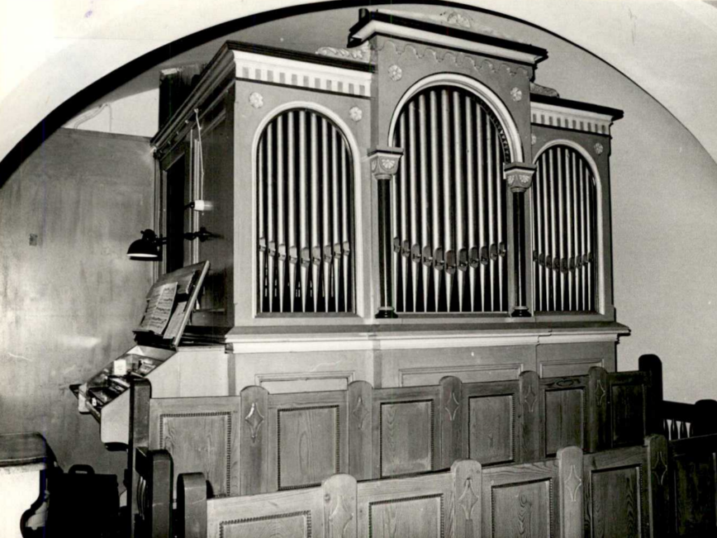 Spieltisch vorne. Prospektgehäuse: drei nachklassizistische (neuromanische) Rundbogenfelder